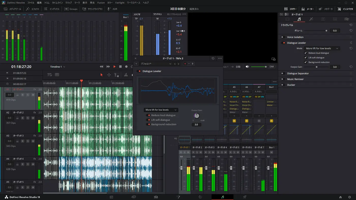 少し難しいですが、とにかく、複数のマイクを使用する場合やトラックを重ねる場合はラウドネスが基準を超えてしまうことがあるため、最終的な書き出し段階でもノーマライズを実施するのです。DaVinci Resolveでは、上記で挙げた設定を有効にすることで、最終的なデータで指定のラウドネス値とトゥルーピーク値に調整してくれます。