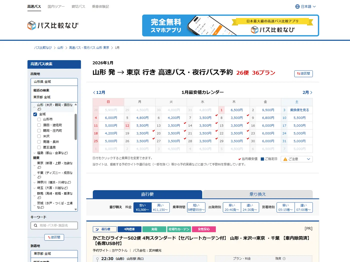 おすすめは「バス比較なび」で複数の運行会社の料金を確認します。『山形 東京 バス』で検索してみてください。